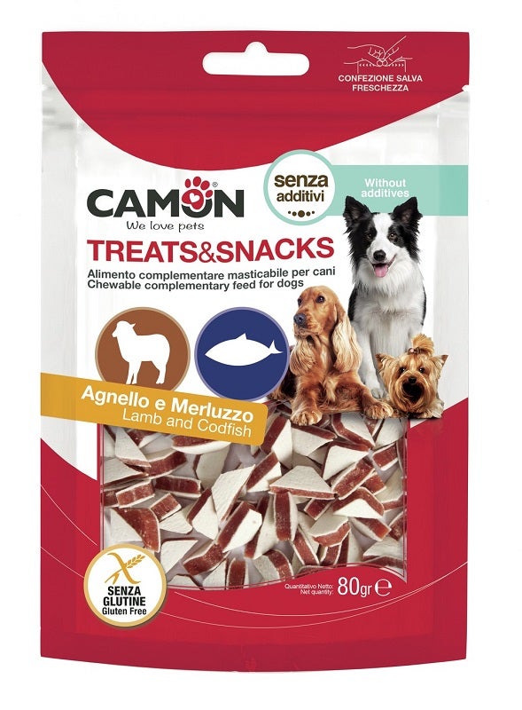 CAMON TREATS & SNACKS Triangolini all'Agnello e Merluzzo Descrizione Deliziosi spuntini ricompensa per cani adulti a base di agnello e...