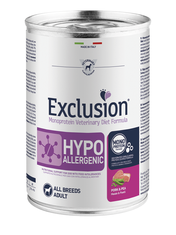 Exclusion Veterinary Diet Formula Hypoallergenic Per Cani Maiale/Piselli Lattina 400gr