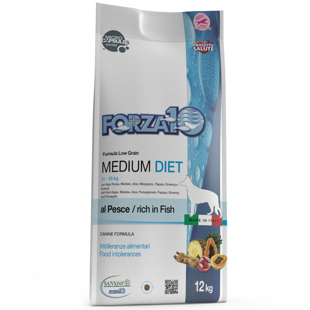 FORZA10 MEDIUM DIET al Pesce Alimento dietetico completo per cani di media taglia. Con piccole microsfere (Microcapsules) che racchiudono e...