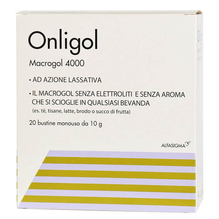 Onligol Dispositivo medico CE, classe IIa. Macrogol 4000 senza elettroliti e senza aroma, ad azione lassativa. Modalità d'uso Si scioglie...