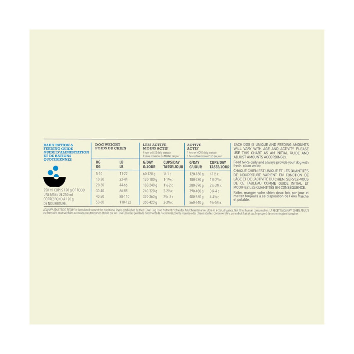 ACANA Dog Adult Dog Recipe è formulato in linea con i livelli nutrizionali stabiliti da FEDIAF per l’alimentazione di mantenimento per cani adulti.