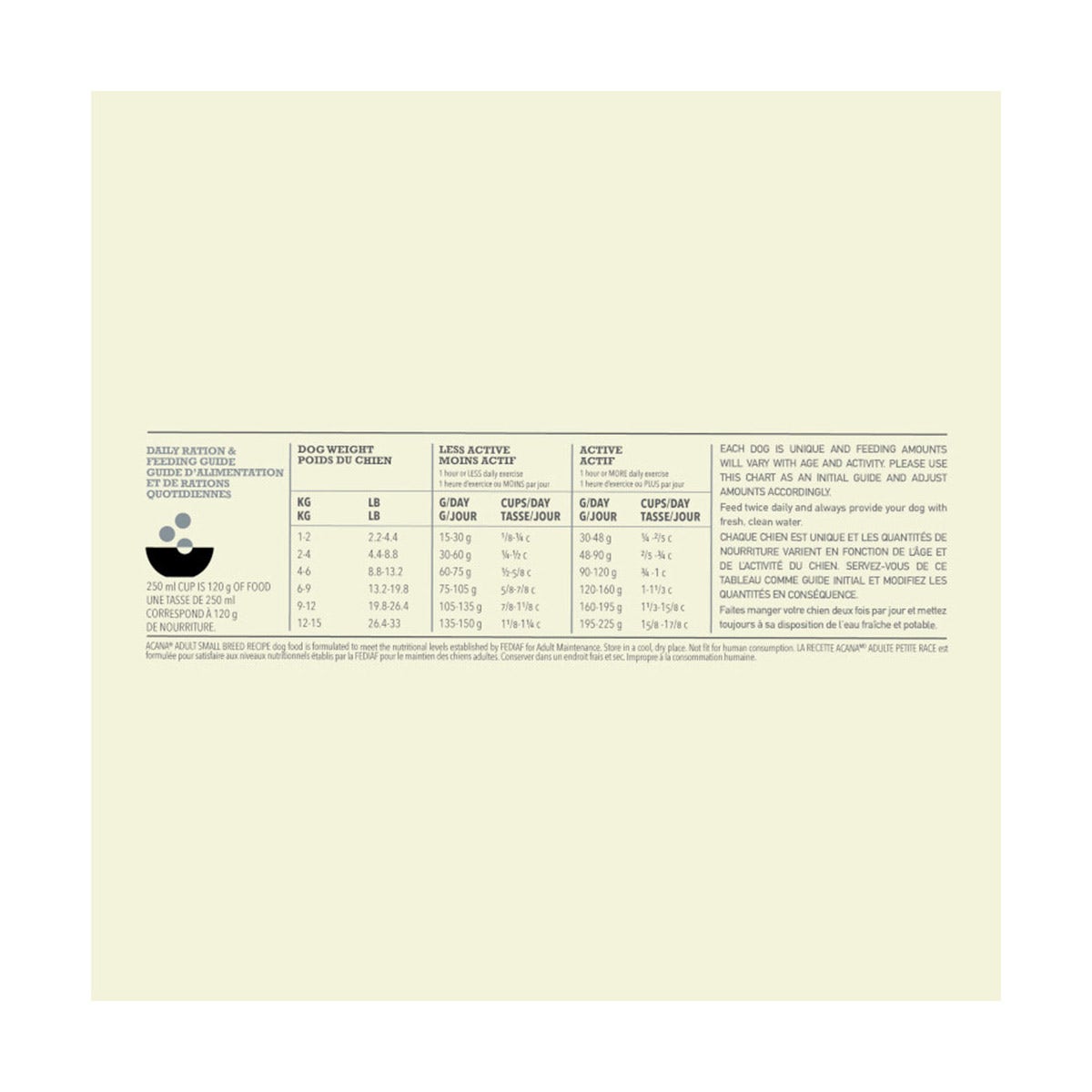 ACANA Dog Adult Small Breed Recipe è formulato in linea con i livelli nutrizionali stabiliti da FEDIAF per l’alimentazione di mantenimento per cani adulti.