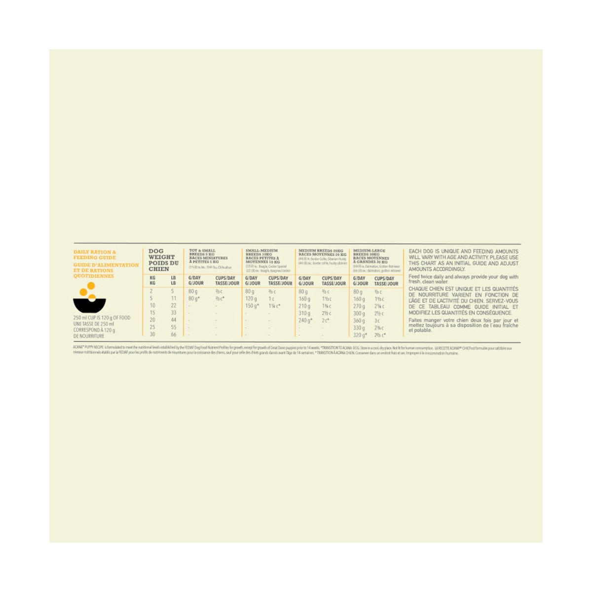 ACANA Dog Puppy Recipe è formulato in linea con i livelli stabiliti da FEDIAF per l’alimentazione adatta a cuccioli in crescita di tutte le taglie, ad esclusione dei cuccioli di Alano in crescita prima delle 14 settimane.