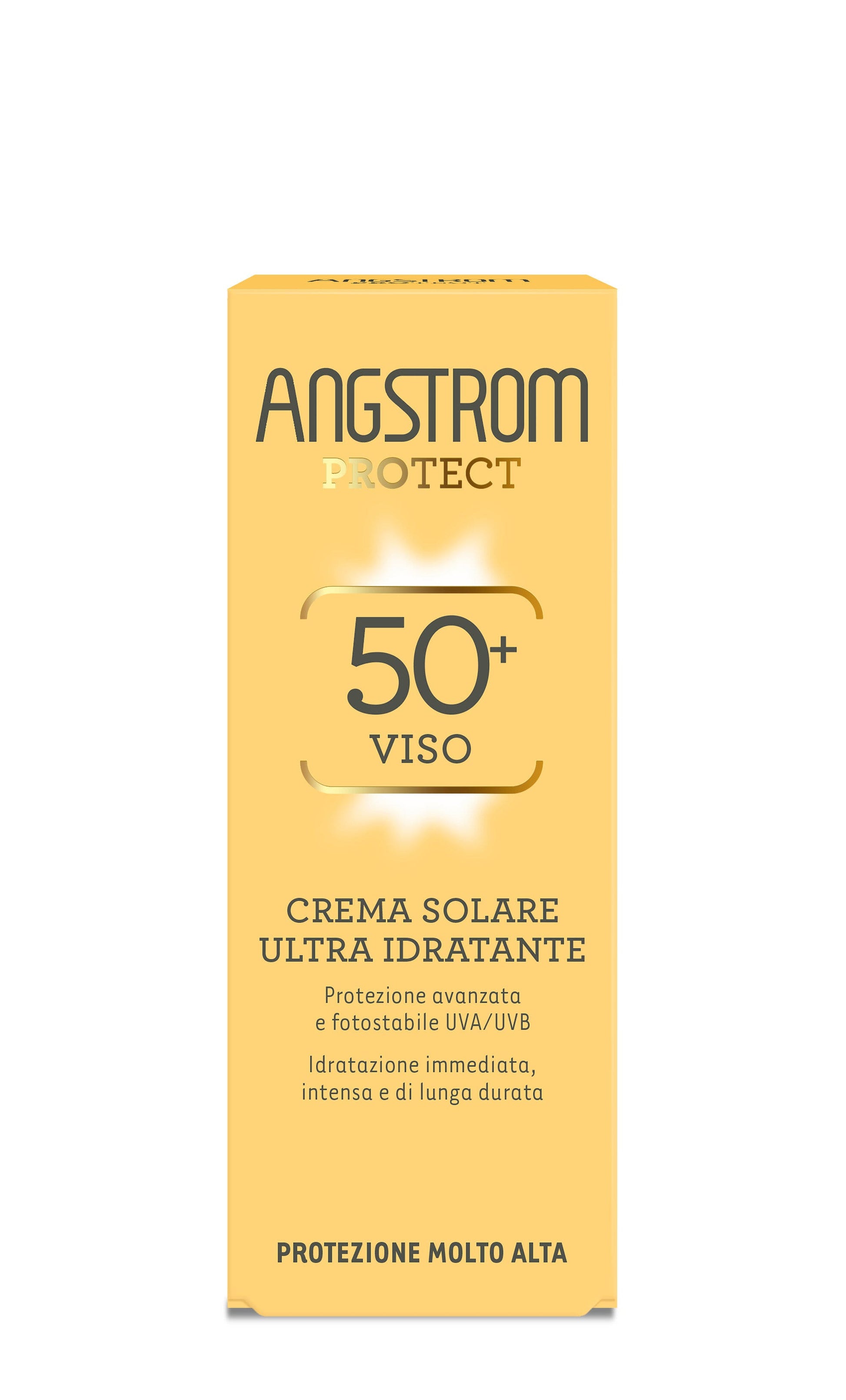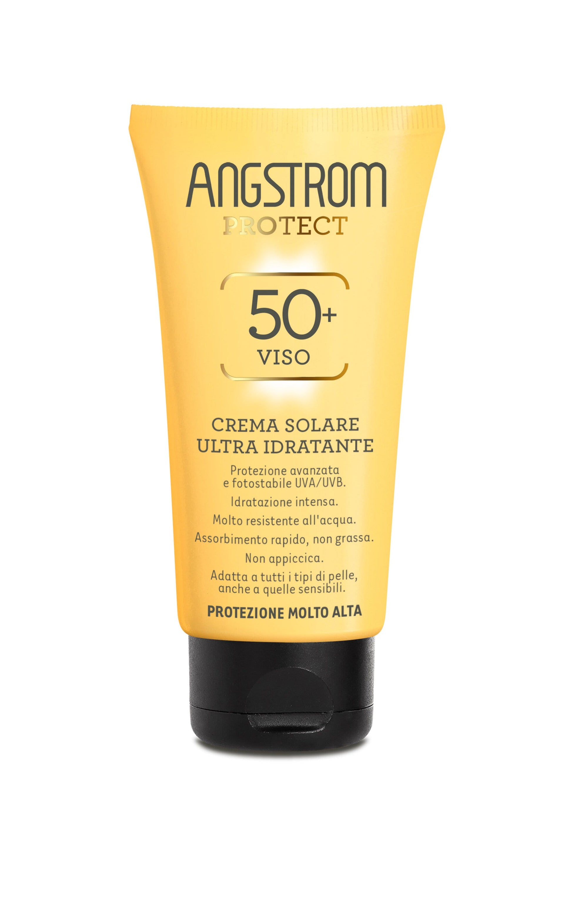 Angstrom Crema Solare Viso Ultra Protettiva 50+. Contiene filtri solari UVA/UVB avanzati, fotostabili, ad ampio spettro e un'incrementato difesa UVA per un'immediata protezione dai raggi solari nocivi. La sua formulazione è arricchita con Glicerina e altri umettanti noti per migliorare e mantenere a lungo il naturale livello di idratazione della pelle. Ha una consistenza leggera, non grassa. Si applica facilmente senza lasciare residui visibili. Molto resistente all'acqua e al sudore. Indicato per pelli sensibili. Non profumato. Dermatologicamente testato.