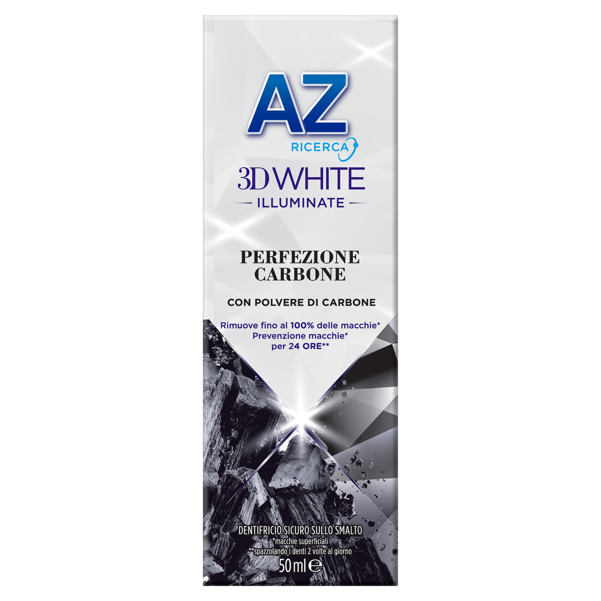La formula rivitalizzante del dentifricio AZ 3DWhite Illuminate Perfezione Carbone protegge attivamente dalle macchie superficiali per 24 ore, spazzolando i denti due volte al giorno.
