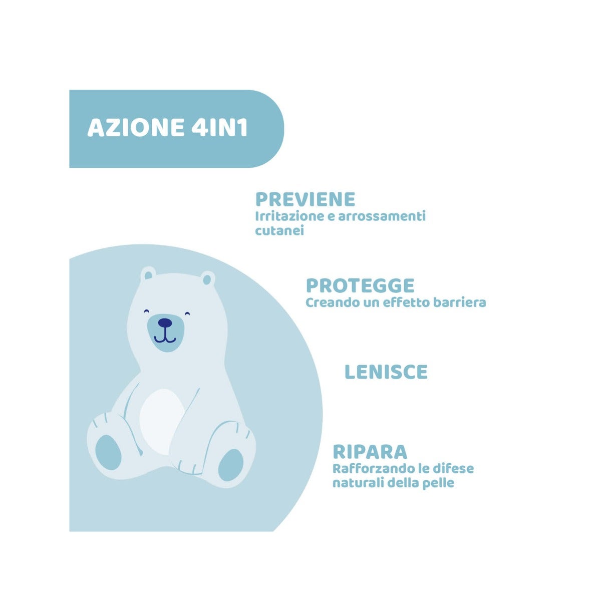Ossido di Zinco al 10% con proprietà lenitive; Burro di Karitè per un effetto barriera ed azione rigenerante; Pantenolo (Pro-Vitamina B5) con funzione idratante, emolliente e lenitiva; Vitamina E per una azione lenitiva e protettiva.