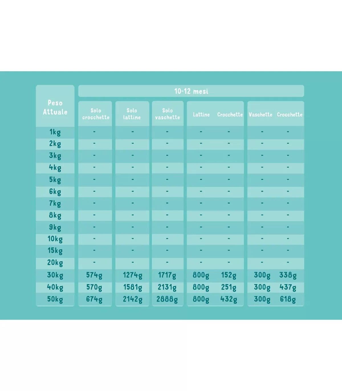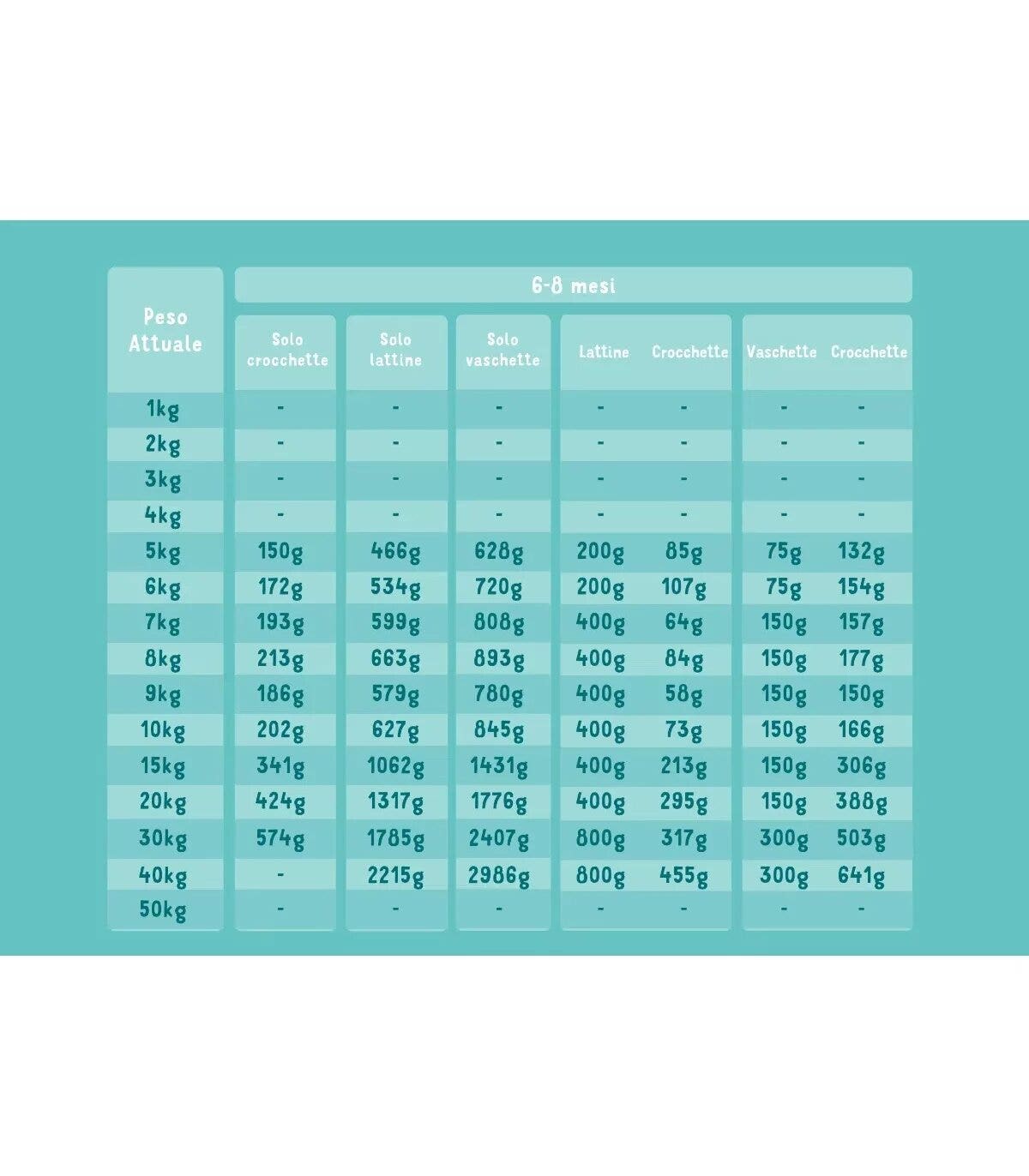 Componenti analitici: proteina grezza 9,5%, grassi grezzi 5,5%, fibra grezza 0,3%, ceneri grezze 2,2%, umidità 82%.