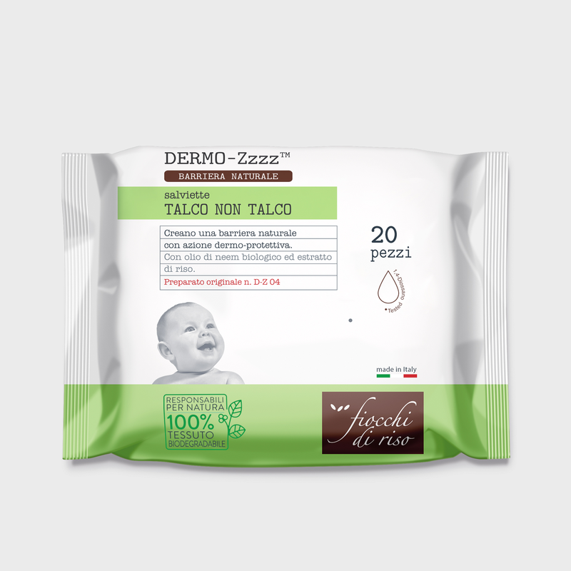 Le salviette talco non talco lasciano la pelle del bambino fresca, morbida e setosa grazie alla presenza dell'amido di mais dalle proprietà assorbenti.