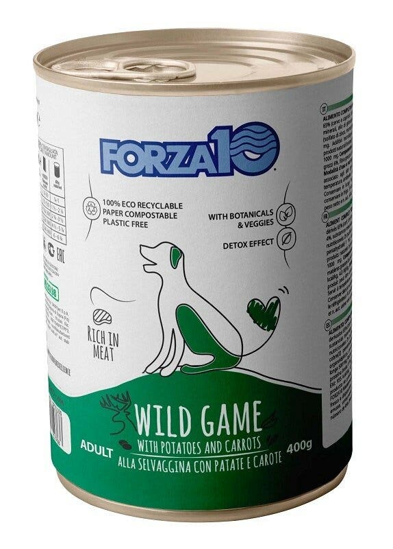 Alimento completo per cani adulti alla selvaggina con patate e carote.