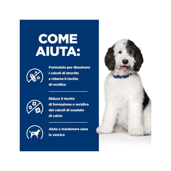 Alimento dietetico completo per la riduzione delle recidive dei calcoli di struvite, per la dissoluzione dei calcoli di struvite e per la riduzione della formazione dei calcoli di ossalato nei cani adulti. Questo alimento ha proprietà che consentono la sottosaturazione urinaria per la struvite, proprietà alcalinizzanti le urine e un basso livello di magnesio, calcio e vitamina D.