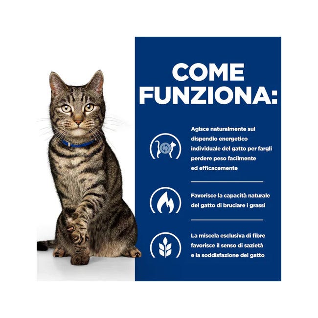 Alimento dietetico completo per la riduzione del peso corporeo in eccesso e per il mantenimento del peso sano nei gatti adulti. Questo alimento ha una bassa densità energetica. Nutrizione clinicamente provata per aiutare i gatti a perdere peso rapidamente.