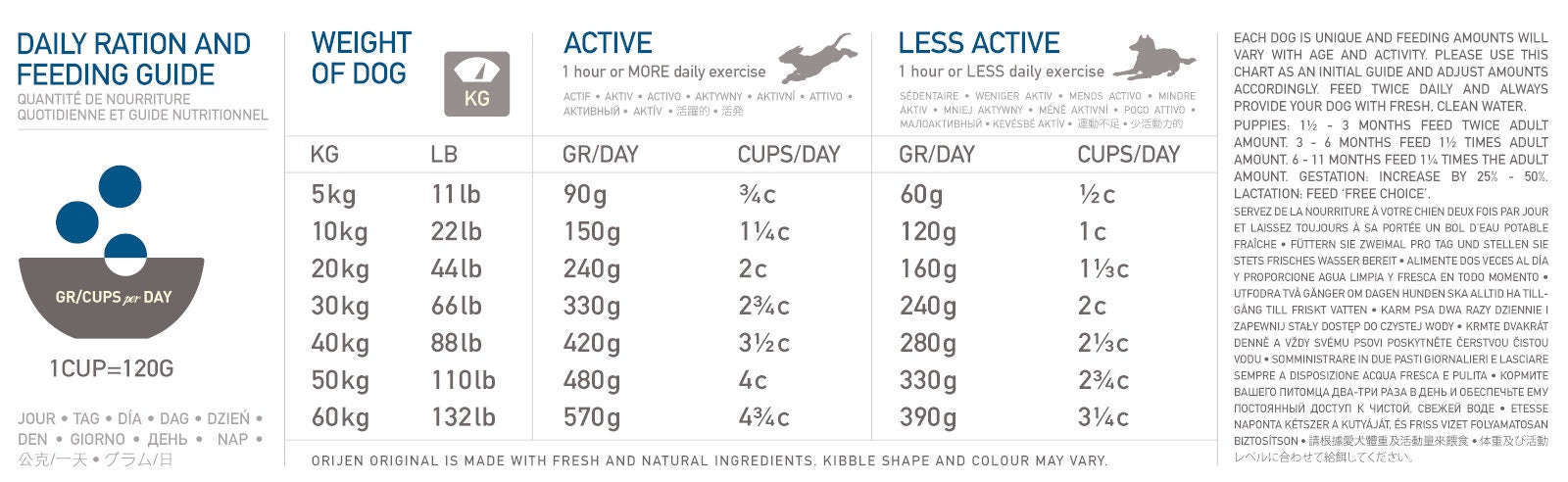 - Grazie al 38% di ricche e nutrienti proteine e al contenuto di carboidrati limitato al 19%, ORIJEN fornisce ai cani di tutte le razze e in ogni fase di vita i nutrienti necessari.