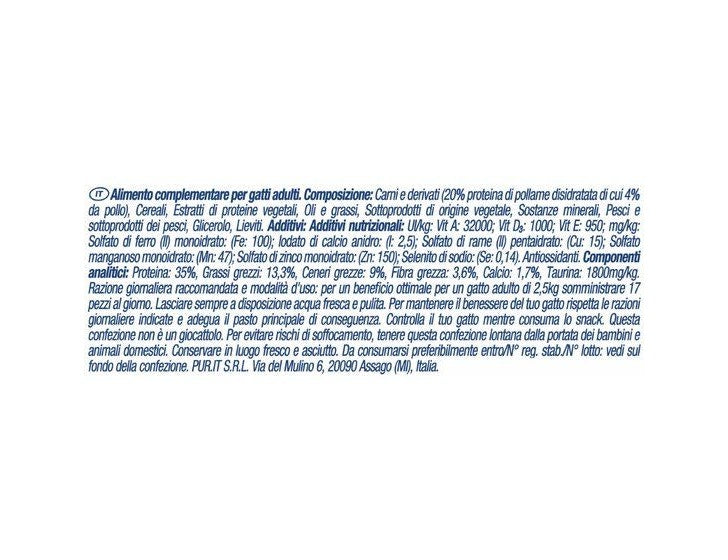 Razione giornaliera raccomandata e modalità d'uso: per un beneficio ottimale per un gatto adulto di 2,5kg: 17 pezzi al giorno
