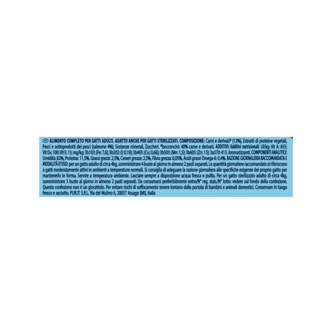 Composizione: Carni e derivati* (12%), Estratti di proteine vegetali, Pesci e sottoprodotti dei pesci, Sostanze minerali, Zuccheri. *bocconcini: 40% Carni e derivati.