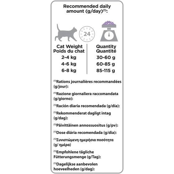 Le quantità di cibo, volte a mantenere un’ideale condizione corporea, varieranno in base all’età del gatto, al livello di attività, all’ambiente.