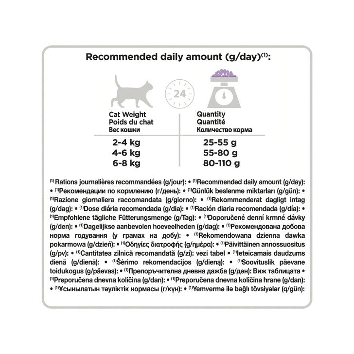Le quantità di cibo, volte a mantenere un’ideale condizione corporea, varieranno in base all ’età del gatto, al livello di attività e all’ambiente.