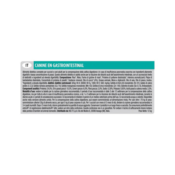 Il periodo d’uso raccomandato è dalle 3 alle 12 settimane per la compensazione della cattiva digestione, ma per tutta la vita in caso di insufficienza pancreatica cronica, e da 1 a 2 settimane per la riduzione dei disturbi acuti dell’assorbimento intestinale, durante le diarree acute e i periodi di convalescenza successivi. Si raccomanda di chiedere il parere di un veterinario prima dell’uso e per la guida all'alimentazione dei cuccioli. Si raccomanda acqua a volontà. Disponibile anche nel formato umido. Per la compensazione della cattiva digestione, può essere somministrata un'alimentazione mista.