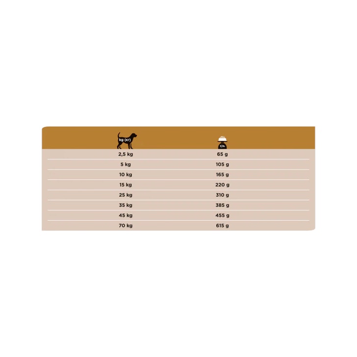 Per cani oltre i 70 kg di peso: per ogni 5 kg di peso corporeo in più, somministrare ulteriori 30 g di alimento secco.