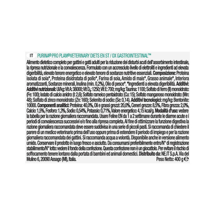 Feline EN St/ Ox Gastrointestinal è un alimento dietetico completo per gattini e gatti adulti per la riduzione dei disturbi acuti dell’assorbimento intestinale, la ripresa nutrizionale e la convalescenza.