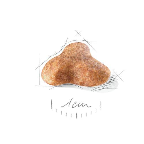 Una crocchetta studiata appositamente per facilitarne la prensione e stimolare il Carlino a masticare il suo pasto.