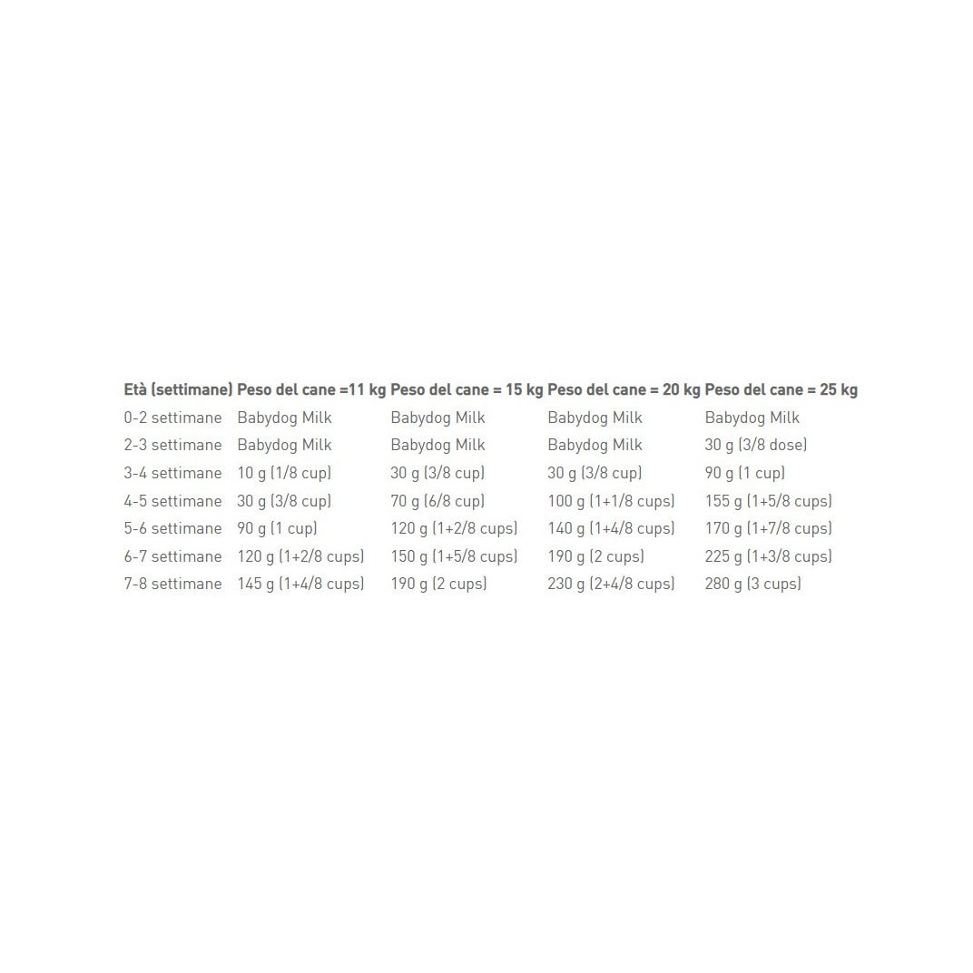 20 kg | BABY DOG MILK | 30 g | 100 g | 140 g | 190 g | 230 g |
