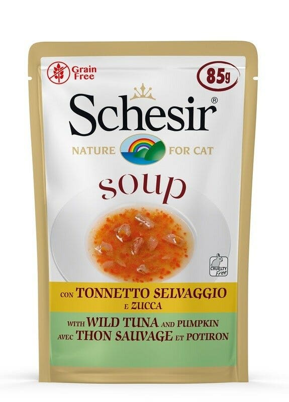 Una ricetta Schesir che abbina i filetti di tonnetto al sapore delicato della zucca. La preparazione è in zuppa, per i gatti che amano l'umido Schesir e soprattutto la sua parte liquida. Buona da gustare da sola, al naturale, oppure mescolata alle crocchette, per un tocco di sapore in più.