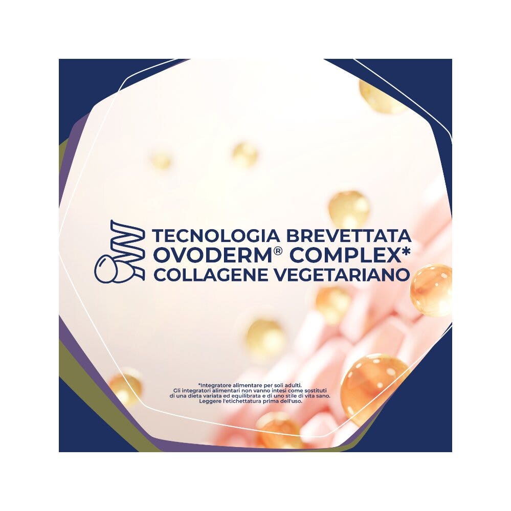 Integratore alimentare in gummies con collagene vegetariano (da membrana d'uovo), elastina, acido ialuronico, vitamina C e minerali, favorisce la produzione di collagene, migliora l'elasticità e la compattezza della pelle contribuendo alla protezione delle cellule dallo stress ossidativo.